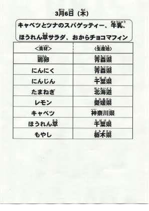 3月6日(木)の献立と食材の産地は以下の通りです。