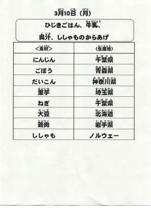 3月10日(月)の献立と食材の産地は以下の通りです。