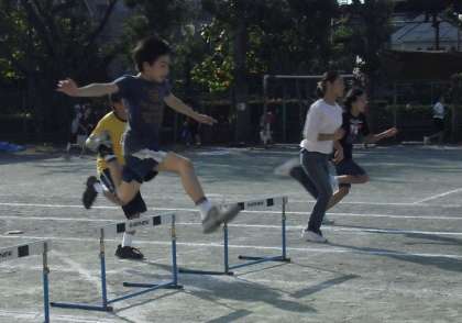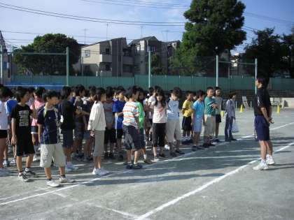 今日、子どもたちは普段着で練習しました。体育着は洗濯しゼッケンをつける作業が進んでいるためです。
