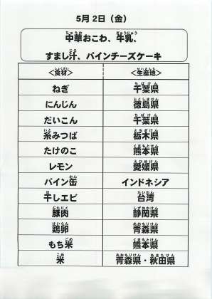 本日の給食で使用した主な食材の産地は以下の通りです。