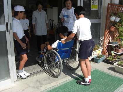 まず、車いすの基本的操作方法を学びました。そして、実際に体験することで、車いすで生活する上での不便(危険)さを普段の生活と重ね合わせて考えられるようにしました。