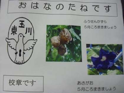 1年生は、先日の就学時健診の時に、育てたアサガオやフウセンカズラの種を袋に入れ「4月には、元気に東玉川小学校に来てください。待っています。」というメッセージをそえて(お手紙)さしあげました。