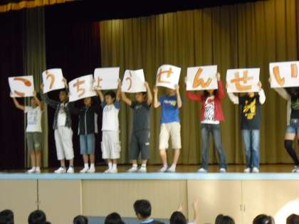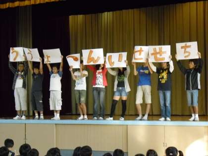 まず、集会委員が、バラバラになった言葉の書いてある紙をかかげます。そのバラバラになった言葉を元に戻して、答えを紙に書きます。全部で5問でした。