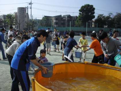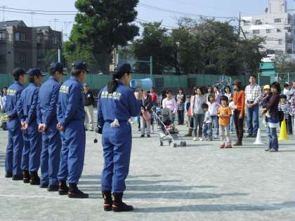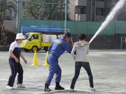 玉川消防署のみなさんに続き消防団のみなさんのご指導のもと自動消火栓放水訓練、バケツリレーを行いました。教職員も全員訓練に参加しました。