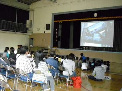 バケツリレーのあと、体育館で阪神淡路大震災から学ぶ「防災ビデオ」を視聴しました。