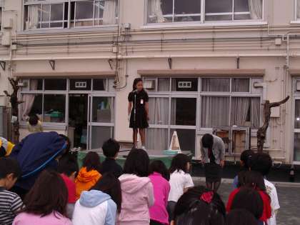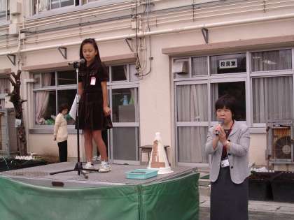 ザ・まつりお楽しみイベント その2は、4年2組代表による「一日校長先生」でした。まず、今日から読書週間が始まりましたので、全校朝会で本の紹介をしてもらうことにしました。題名は「学園は天国、テストは地獄」でした。