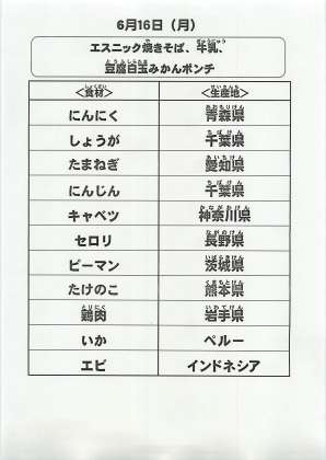 本日の給食で使用した主な食材の産地は以下の通りです。