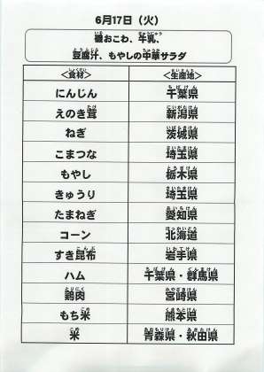 本日の給食で使用した主な食材の産地は以下の通りです。