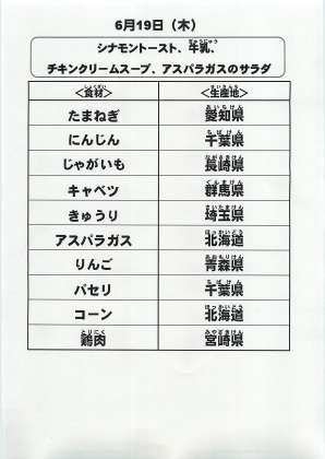 本日の給食で使用した主な食材の産地は以下の通りです。