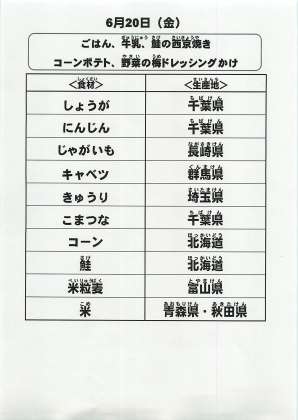 本日の給食で使用した主な食材の産地は以下の通りです。