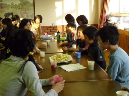 ランチルームで、各グループごとに今日の作業報告をしながらクッキーを食べました。
