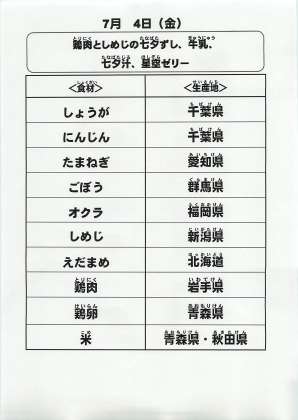 本日の給食で使用した主な食材の産地は以下の通りです。