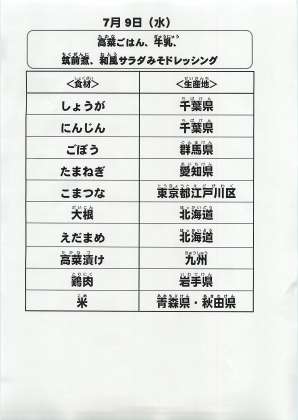 本日の給食で使用した主な食材の産地は以下の通りです。