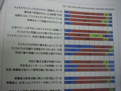 本年度の、保護者アンケートの回収率は96パーセントでした。回答用紙をファイルにはさみ、大封筒に入れて提出していただいたこと、封筒の表にアンケートご協力のお願いを印刷したこと、回収期間を短くしたことなどが高い回収率につながったのかもしれません。