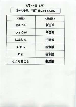 本日の給食で使用した主な食材の産地は以下の通りです。