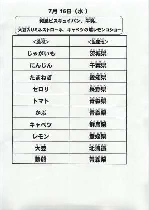 本日の給食で使用した主な食材の産地は以下の通りです。
