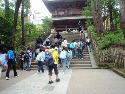北鎌倉を降りると、5年生はすぐに源氏山公園をめざして歩き出しましたが、6年生は、円覚寺に立ち寄り、鎌倉時代の建造物の見学をしました。緑の木立の中にたたずむ鎌倉建築は、子どもたちの心中にも響いた物があったようで、課題の俳句を一生懸命に詠んでいました。
