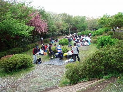 頼朝の像の近くで、昼食をとり記念撮影をしました。ここでは、区内他校の5・6年生とも出会いました。