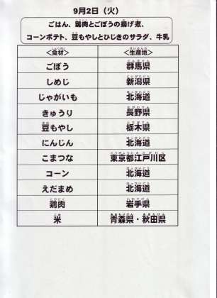 本日の給食で使用した主な食材の産地は以下の通りです。