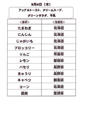 本日の給食で使用した主な食材の産地は以下の通りです。