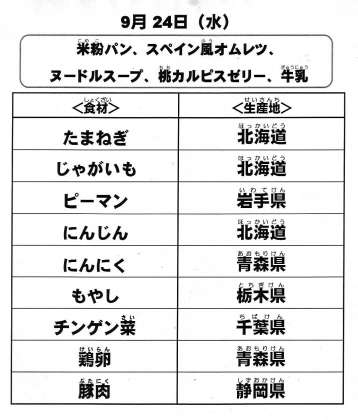 本日の給食で使用した主な食材の産地は以下の通りです。