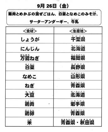 本日の給食で使用した主な食材の産地は以下の通りです。