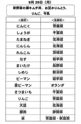 本日の給食で使用した主な食材の産地は以下の通りです。