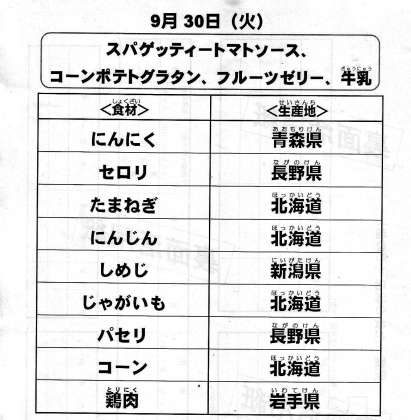 本日の給食で使用した主な食材の産地は以下の通りです。