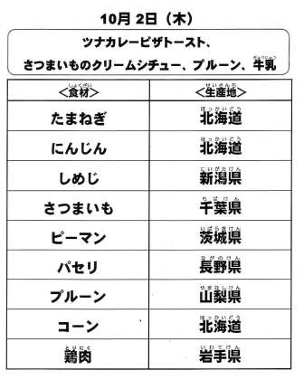 本日の給食で使用した主な食材の産地は以下の通りです。