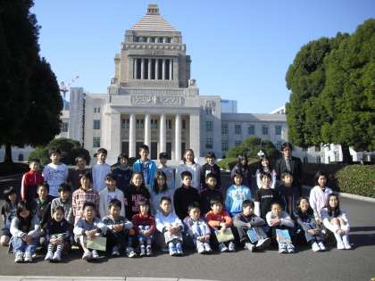 最初に、国会衆議院を見学しました。衆議院参観者ホールが満員になるほど混雑していたため、衆議院本会議場では、ゆっくり説明に耳をかたむける時間もないほどでした。子どもたちは、入口で配布されたパンフレットを熱心に読んでいました。