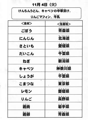 本日の給食で使用した主な食材の産地は以下の通りです。