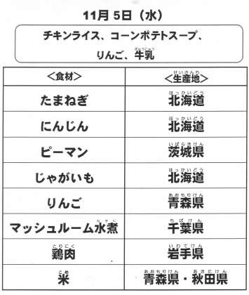 本日の給食で使用した主な食材の産地は以下の通りです。