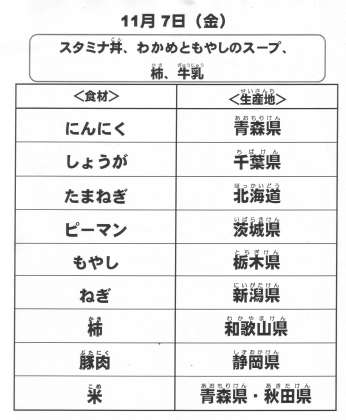 本日の給食で使用した主な食材の産地は以下の通りです。