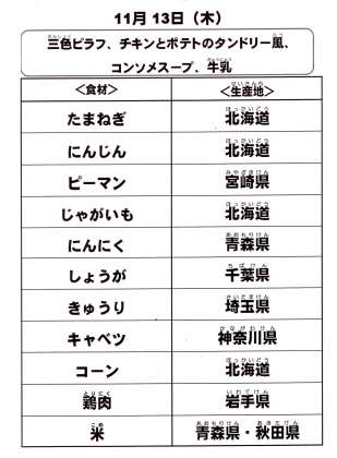 本日の給食で使用した主な食材の産地は以下の通りです。