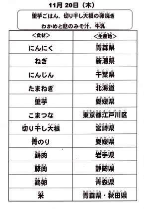 本日の給食で使用した主な食材の産地は以下の通りです。