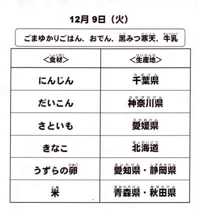 本日の給食で使用した主な食材の産地は以下の通りです。