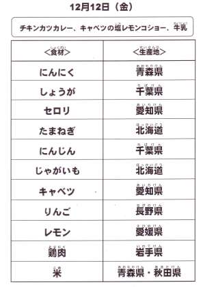 本日の給食で使用した主な食材の産地は以下の通りです。