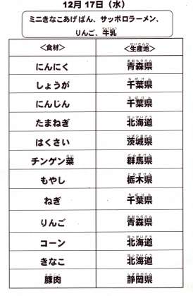 本日の給食で使用した主な食材の産地は以下の通りです。