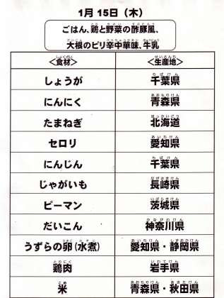 本日の給食で使用した主な食材の産地は以下の通りです。