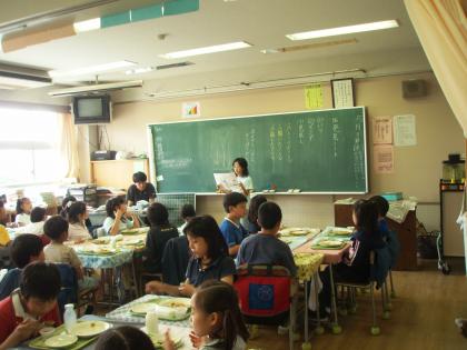 今日は月1回の給食キャンペーンの日です。5・6年生の給食委員会の児童が各クラスで今月の給食目標についての発表をします。ちなみに今月目標は、「あとかたづけを上手にしよう」です。食べ終わった後、各階のリフトの前に、クラスごとに片付けをします。給食主事さんが片付けをしやすいようにと心がけて、後かたづけをします。