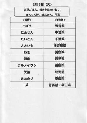 本日の給食で使用した主な食材の産地は以下の通りです。