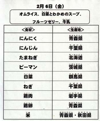 本日の給食で使用した主な食材の産地は以下の通りです。