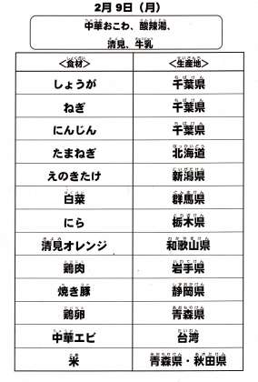 本日の給食で使用した主な食材の産地は以下の通りです。