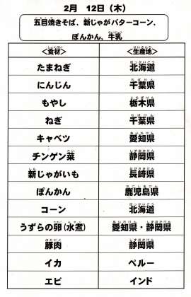 本日の給食で使用した主な食材の産地は以下の通りです。