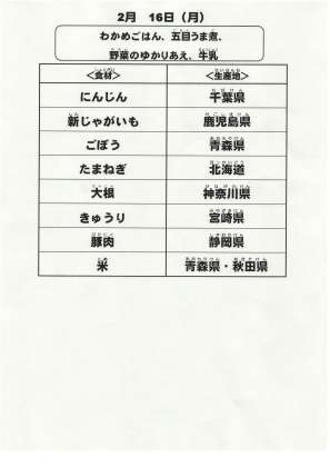本日の給食で使用した主な食材の産地は以下の通りです。