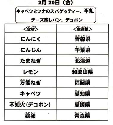 本日の給食で使用した主な食材の産地は以下の通りです。
