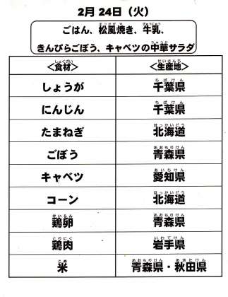 本日の給食で使用した主な食材の産地は以下の通りです。