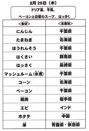 本日の給食で使用した主な食材の産地は以下の通りです。