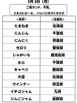 本日の給食で使用した主な食材の産地は以下の通りです。