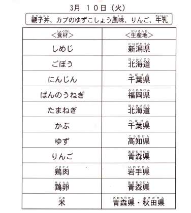 本日の給食で使用した主な食材の産地は以下の通りです。